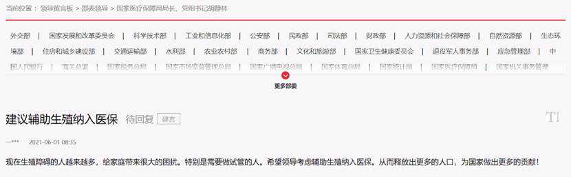 是否考虑将辅助生殖纳入医保范围。据了解,日本、澳大利亚和德国等国都将辅助生殖技术作为一种福利向全民提供,以提高本国的生育率。如德国就在2004年将辅助生育技术中的试管婴儿和单一精子显微注射列入患者和医保共同支付范畴,其中患者支付额度约为1500~2000欧元。近期看到有网友也提出此建议。