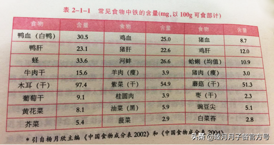 日常食物中铁含量高的食物:鸭肝、鸭血、鸡血、鸡肝、猪肝;木耳、紫菜、蘑菇、葡萄干、栆;油菜、黄花菜、菠菜、白菜苔等,在一日三餐中可以多吃一些。