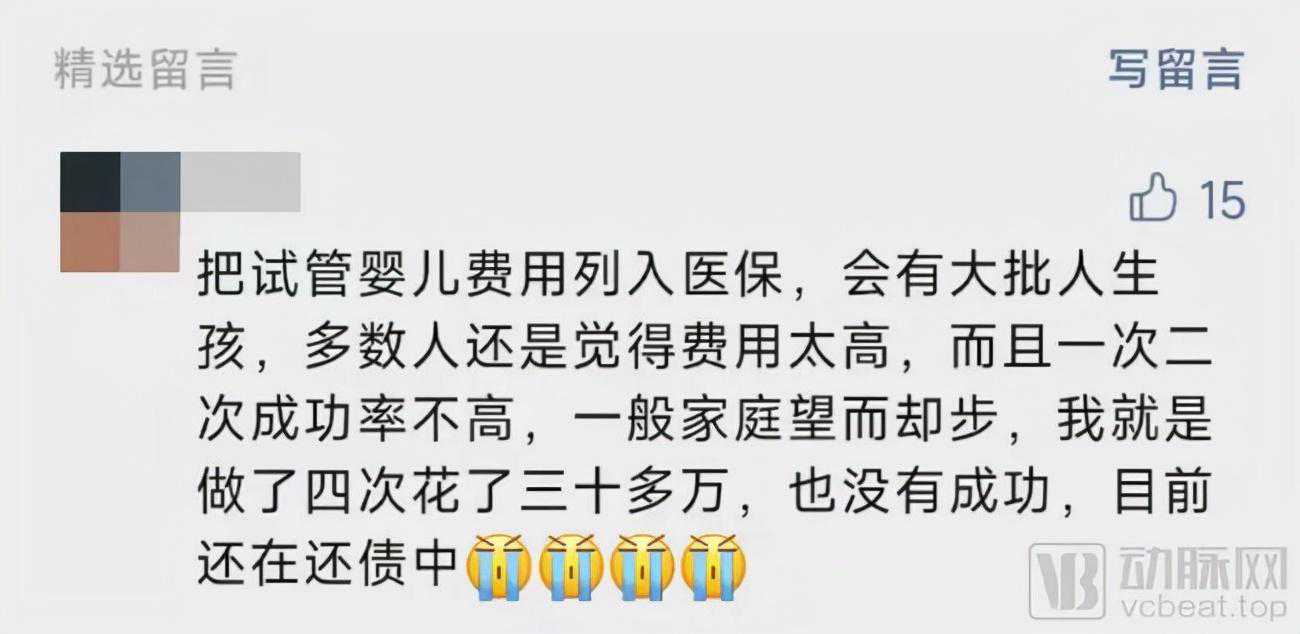 “把试管婴儿费用列入医保,会有大批人生孩,多数人还是觉得费用太高,而且一次二次成功率不高,一般家庭望而却步,我就是做了四次花了三十多万,也没有成功,目前还在还债中。”在此前动脉网发布的《》一文中,有读者文末留言,针砭时弊指出辅助生殖技术缓解中国人口形式的根源在于,患者端的支付难题。