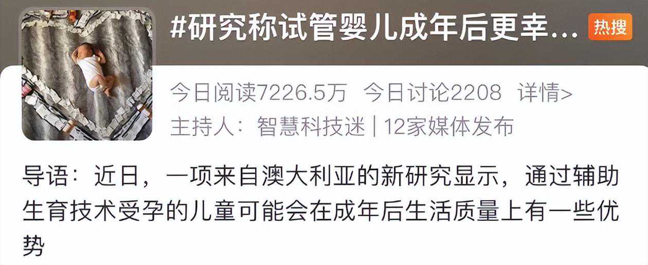 3月24日晚,一条名为“研究称试管婴儿成年后更幸福”的消息冲上新浪微博热搜第9名。截至当晚,有超过7000万人阅读了相关新闻。