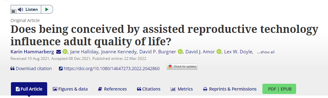 原来,这是一项由澳大利亚科研团队完成的最新研究成果,3月22日刚刚在线发表在英国知名学术期刊《HumanFertility》(人类生育能力)上。该研究通过调查数百位借助人类辅助生殖技术(俗称试管婴儿)孕育出生的人,和同时期通过自然孕育出生的人相对比后,发现受调查的试管婴儿成年后在社会关系、心理健康等方面都更有优势。