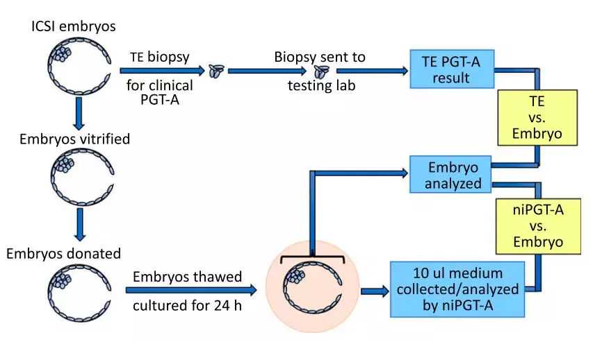 该团队使用52个囊胚测试了niPGT-A的准确性,这些囊胚是由接受不孕症治疗的患者捐赠的。每个胚泡都已经过外部实验室的TE活检。研究人员比较了来自周围培养基和TE活检样品的DNA的测序结果,以及通过对整个胚胎进行测序获得的真实结果。