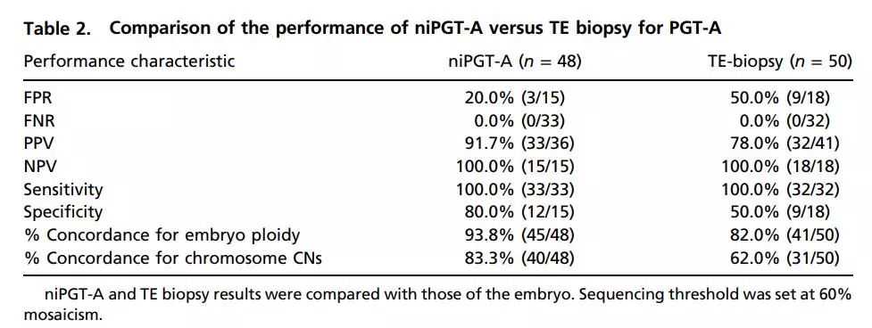 PGT-A的niPGT-A与TE活检的性能比较