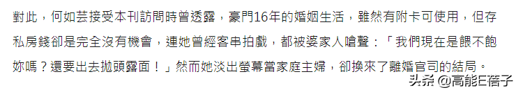而且16年豪门婚姻,虽然有副卡可以用,但她一点存私房钱的机会都没有,连客串拍戏也要被婆家骂:“我们现在是喂不饱你吗,还要出去抛头露面!”
