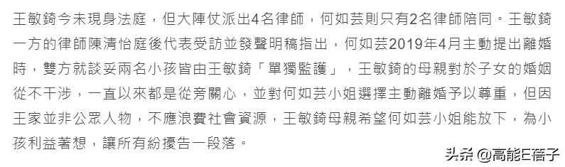 而王的律师天团则回应,双方谈判卡住的主要原因,是何如芸原本谈妥接受让王敏錡对两名小孩“单独监管”,还放出王敏錡母亲的话,请何如芸小姐“放下”,为小孩利益着想,让所有纷争告一段落。