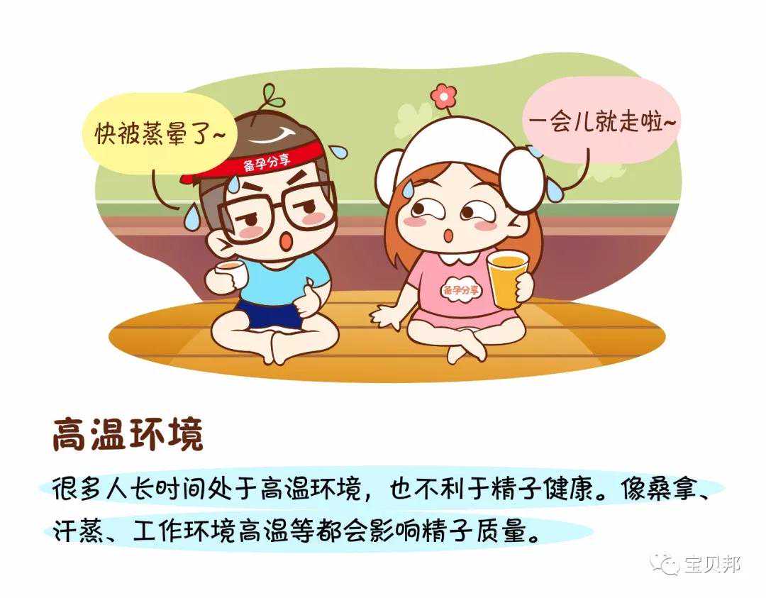 很多人长时间处于高温环境,也不利于精子健康。像桑拿、汗蒸、工作环境高温等都会影响精子质量。