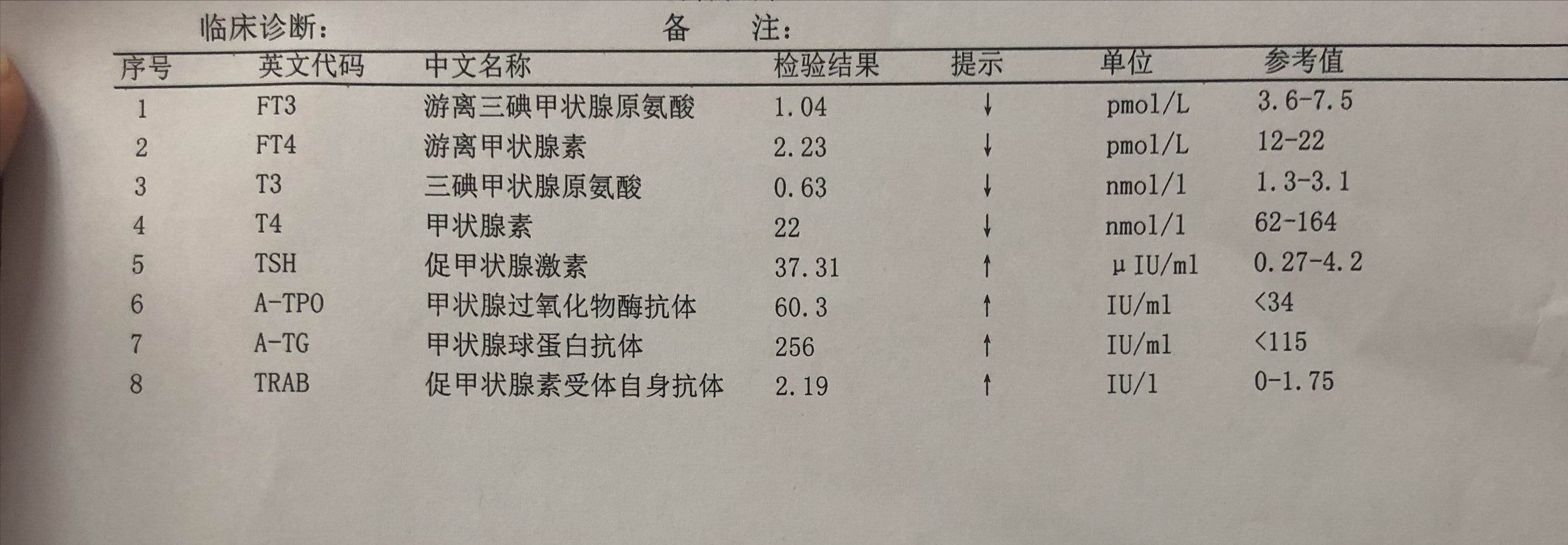 患者的TSH指标上升,A-TPO(甲状腺氧化物酶)达到了256IU/ml,也高于正常值115IU/ml,是比较明显的桥本甲减。