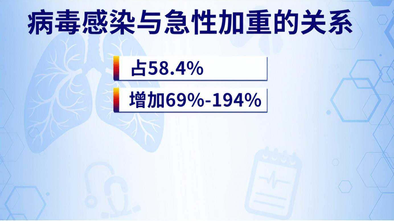 上面这组数字是在我国慢阻肺病急性加重的患者中做的一项调查研究,发现有27%~58.4%的慢阻肺病急性加重都是和病毒感染有关。