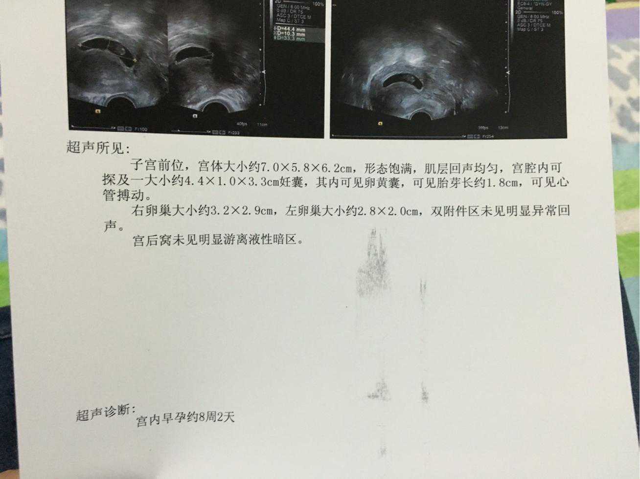 超声检查可见单孕囊、胚芽和胎心搏动。